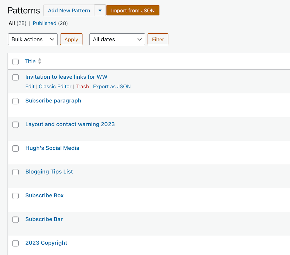 Image showing a list of reusable blocks (now Patterns) on WordPress