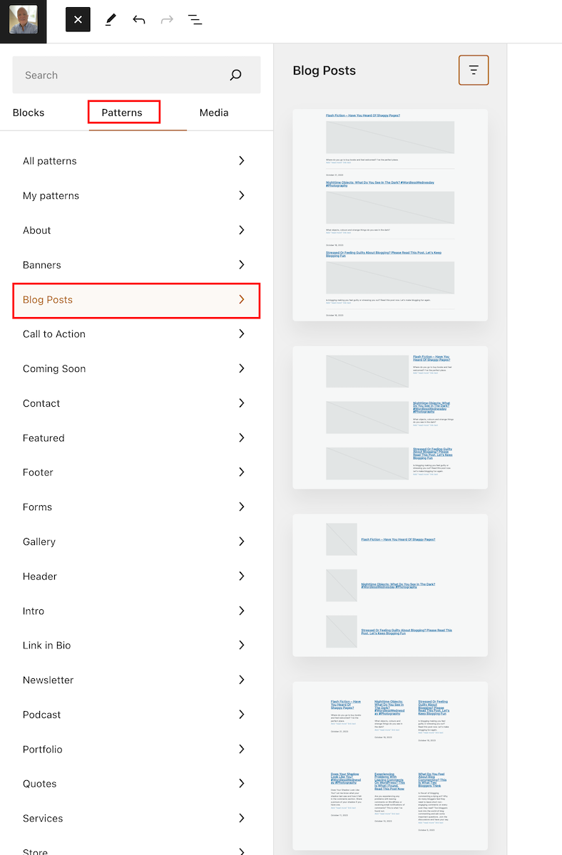 There are various ways to promote older blog posts on newly published posts. This is a new blog post template that WordPress has added to ‘Patterns‘ to help promote previous posts. In fact, WordPress has added lots of new ‘Blog Post’ templates. Here’s one I selected.