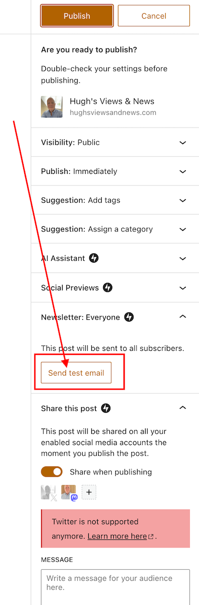 5. The test email is new to me and thank you for pointing it out, Hugh. I love the patterns feature and it is especially helpful for those who use FSE themes since the footer, header, and other templates don’t automatically populate. The subscribe button definitely needs to be fixed. I thought it was my theme but when I switched themes, the mess was still there. As always, I appreciate you sharing your knowledge, Hugh.
