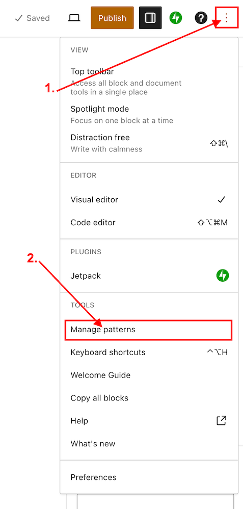 Click ‘Manage Patterns’ to manage reusable blocks.