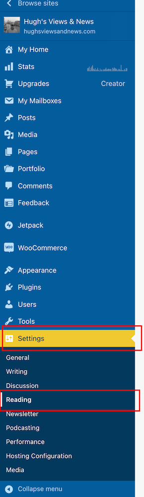Image highlighting 'Settings - Reading' on the dashboard of a WordPress blog.
