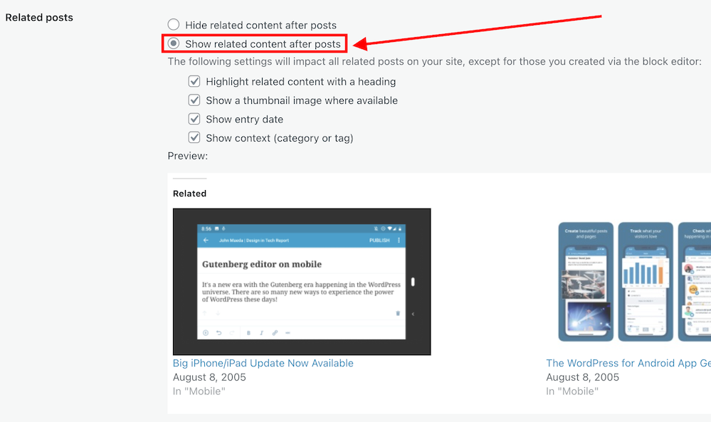 • On the Reading Settings page, look for Related Posts and ensure ‘Show Related Content After Posts’ is switched on.