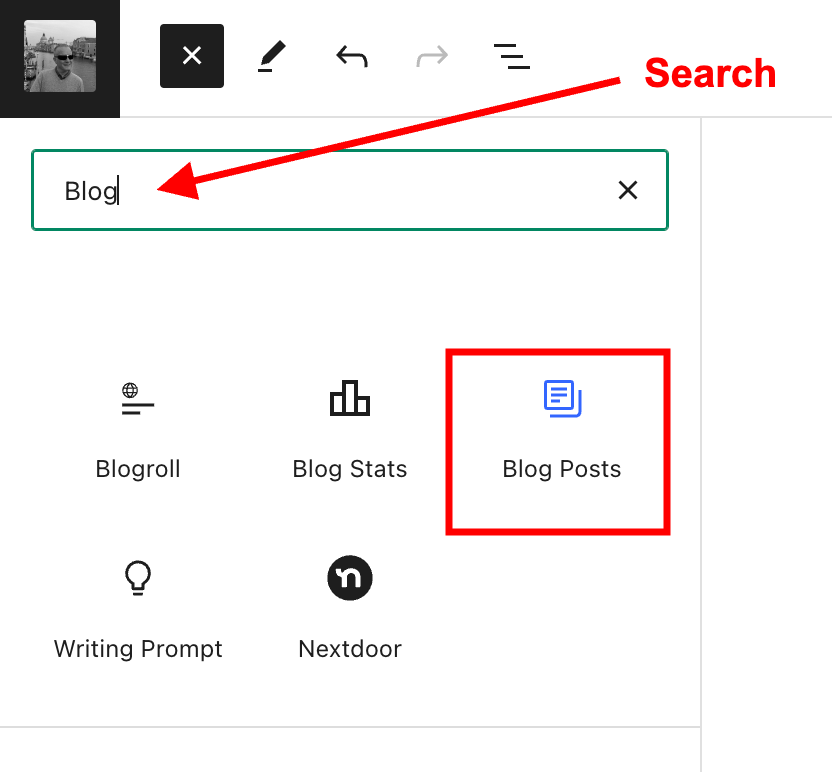 Image highlighting the search box when searching for a block, and the Blog Posts block.