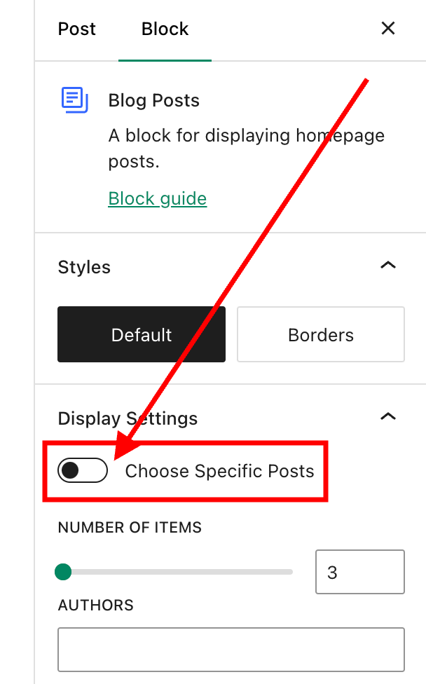 • When you insert the block, a toolbar will open on the right-hand side of the page. Under Display Settings, look for Choose specific posts and slide the button to the ‘on‘ position.