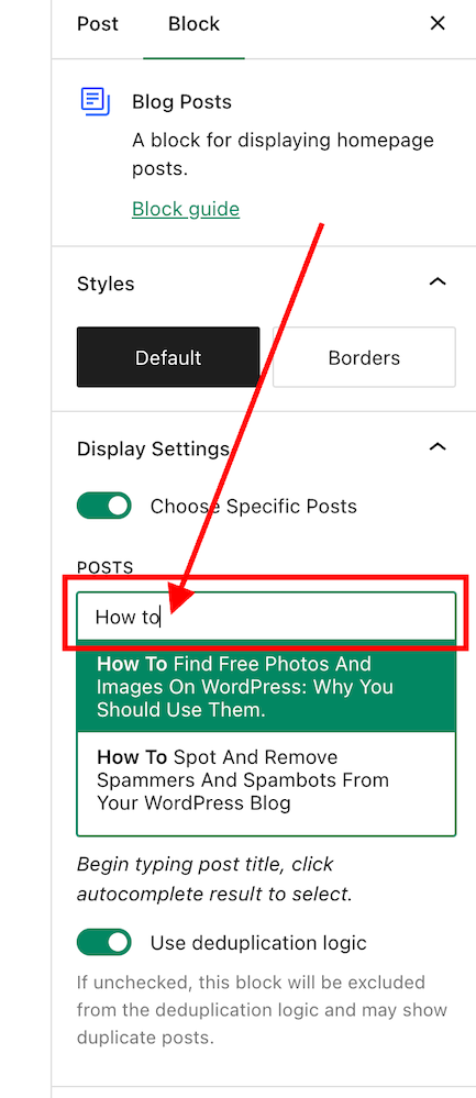 • In the ‘Posts‘ box, type in the blog post title you want to display. As you type, suggestions for blog posts with the words you are using will appear.