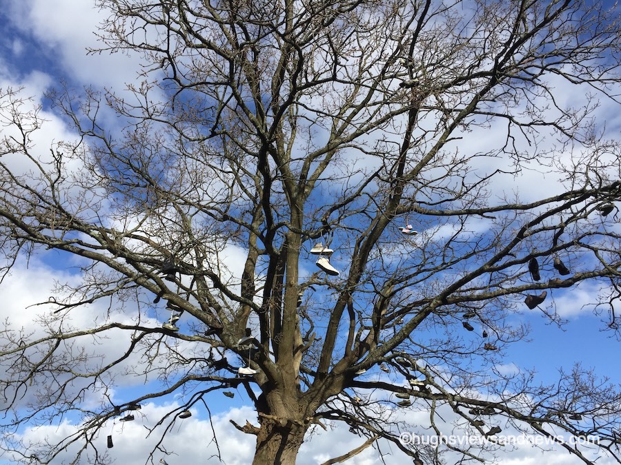 Photo of a bare tree with lots of pairs of shoes and trainers tied to the branches.