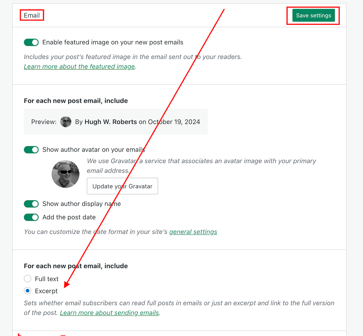• Scroll down to the Emails sections of the Newsletter settings page, and change the ‘For each new post email, include‘ setting back to ‘Excerpt.’