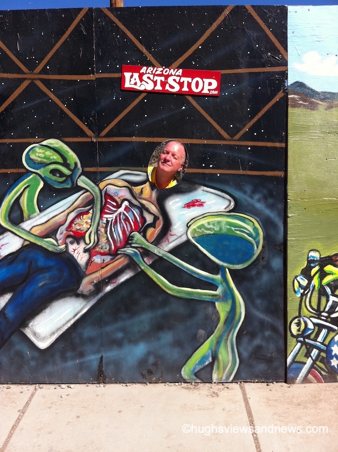 This is what happens when roadside art, aliens, and questionable life choices collide. One moment you’re minding your own business at the ‘Arizona Last Stop,’ the next you’re being casually abducted mid-nap by long-armed extraterrestrials with very flexible elbows.