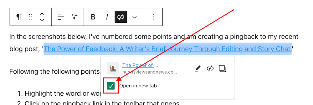 Ticking the ‘open in new tab’ option guarantees that when users click the pingback link, the linked post will open in a new tab or page. This feature effectively retains users on the current page, allowing them to easily return to your post to leave a comment or engage with the content.