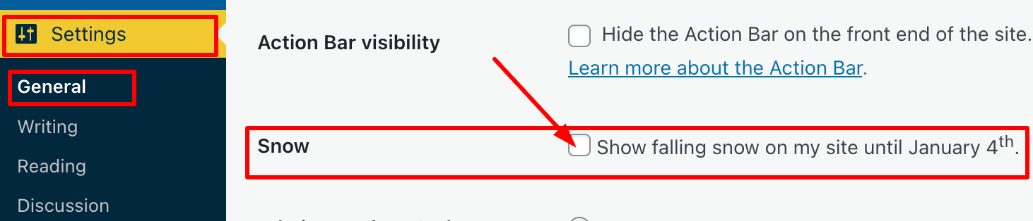You’ll see a box with the words ‘Show falling snow on my site until January 4th.’